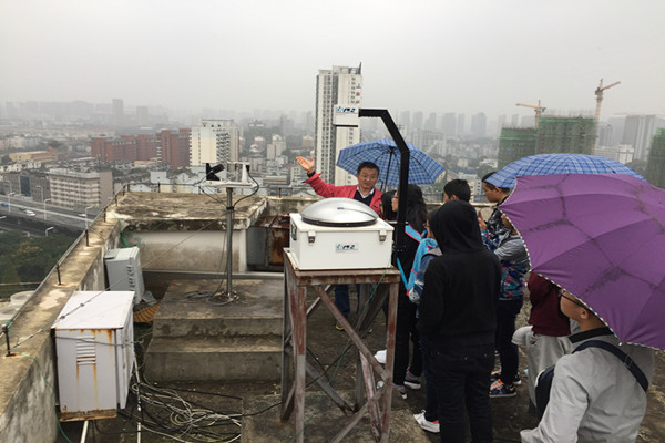 在中科大地空学院李锐教授的带领下,永利官网学生走进一间研究室,里面摆放着一台正在工作的仪器,它的制作者之一袁仁民副教授用通俗的语言向来访学生介绍了这台通过接受光来检测气溶胶的仪器的工作原理,并耐心的解答了学生所提的问题,包括这台仪器所使用的工作环境和核心部件,介绍完这台仪器之后,袁仁民副教授带领大家走上顶楼,参观大气监测的一些仪器,包括雨量计,能见度仪,雨雷达,和前向散射仪,使得永利官网学生对这些仪器有了初步的认识和了解。