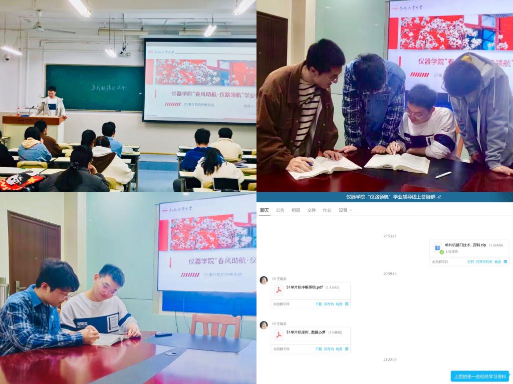 3月12日晚,学院在屯溪路校区主楼328室开展第四期 “春风助航·仪路领航”学业辅导,毕业班优秀学长、三年级本科生共计50余人参加。2019级同学王瑞龙详细总结了《单片机接口技术》课程中“51单片机”章节的重点内容,并结合具体例题进行系统讲解,加深了同学们对知识的理解与应用。学院学业辅导中心坚持“助学、励学、勤学、乐学”的指导思想,在专业课教师和朋辈导师的参与下,组建“一对一”“一对多”帮扶小组,建立线上答疑群,累计形成30余组学习兴趣小组,分享相关课程学习资料30余份,针对性解决了学生在复习备考过程中的问题,有效缓解学生考试压力,帮助学生夯实学习基础。