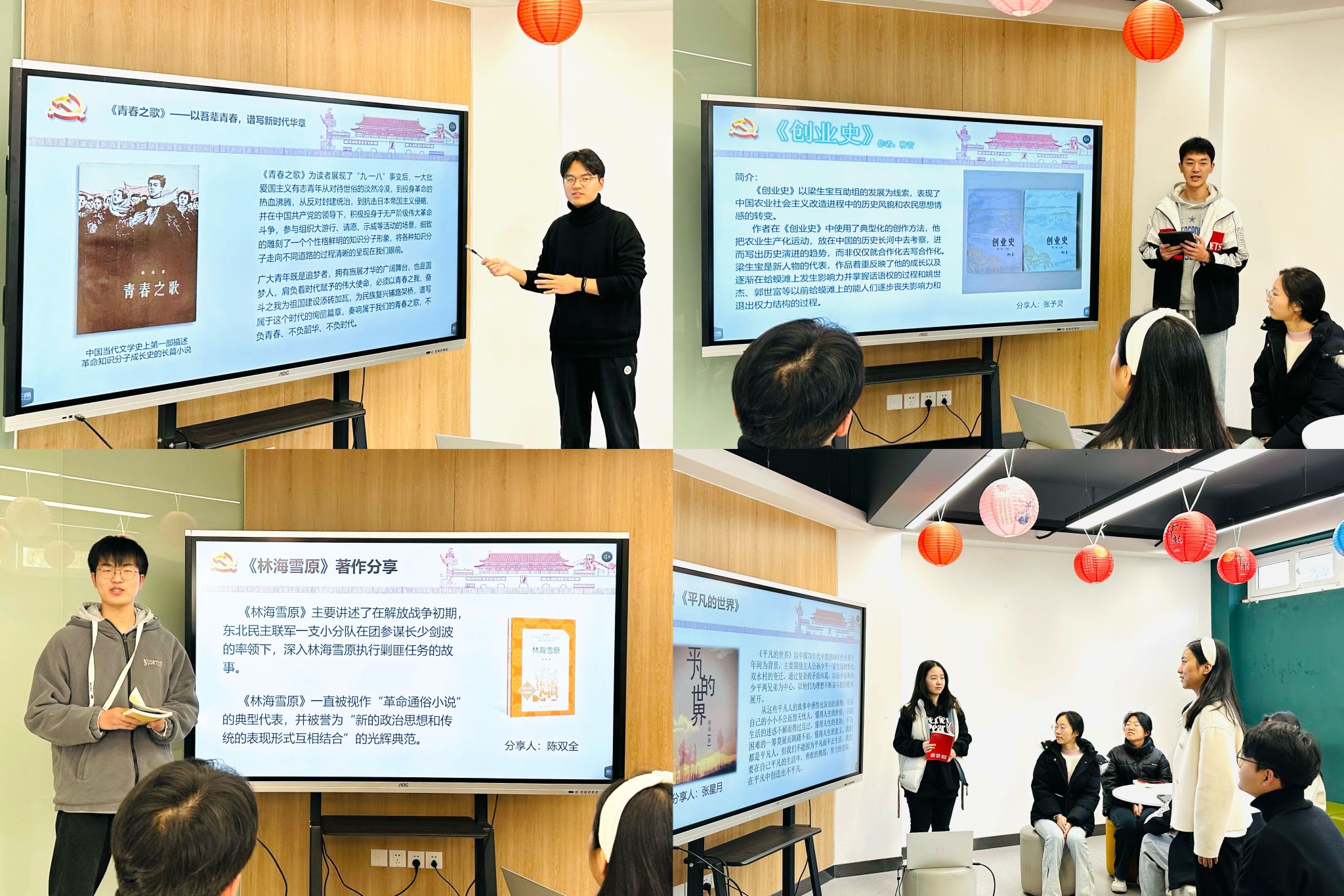 本次读书分享会分为阅读分享与交流讨论两个环节。同学们从一部部红色经典名著、一个个引人入胜的故事入手,既穿越历史,又启迪当代。赵星月以长篇小说《红岩》为切入口,讲述了共产党人视死如归的大无畏英雄气概,阐释了对于红岩精神内涵的理解;徐昂推荐了半自传体小说《青春之歌》,分享了对书中主人公林道静充满坎坷却丰富多彩的人生故事的理解、感受和启示;陈双全分享了阅读《林海雪原》的收获,重温了解放战争初期东北剿匪波澜壮阔的斗争史;张予灵讲述了《创业史》的创作背景,提出了中国农业社会主义改造进程中对艰苦创业精神的思考;张星月从自身体悟出发,结合书中情节、主人公的命运,谈论了阅读《平凡的世界》的所思所感。在交流讨论环节,同学们就新时代下如何将阅读作为大学生培根铸魂、启智增慧的重要途径做了热烈探讨。
