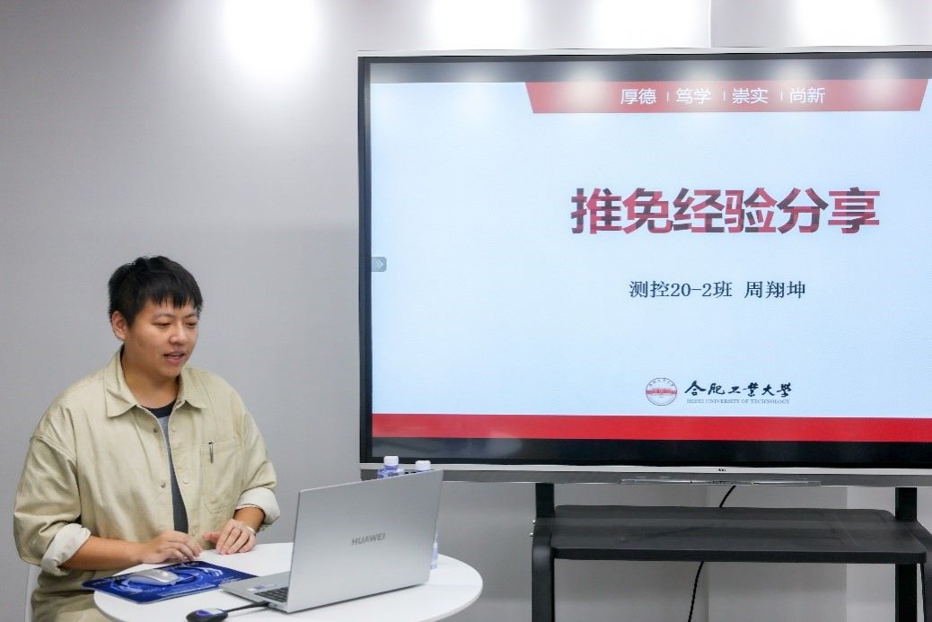 在交流中,主讲人结合自身经历,围绕升学主题从推免夏令营的参营目的、录取要求、流程时间,预推免的前期准备、录取方式、录取标志等相关流程进行了详细介绍。周翔坤同学从“打好基础”“提升能力”“正确定位”三个方面分享了自己的大学四年的生活,引导低年级学生要注重课堂学习,强化自律能力。金紫涵同学从“重基础提能力”“重平时稳心态”“明目标敢奋斗”三个方面分享了自己的推免历程,并介绍了自己在英语水平提升和科研素养培养上的相关经验。分享结束后,两位主讲人与现场同学积极互动,热心解答同学们的疑问,活动在轻松愉悦的氛围钟结束。