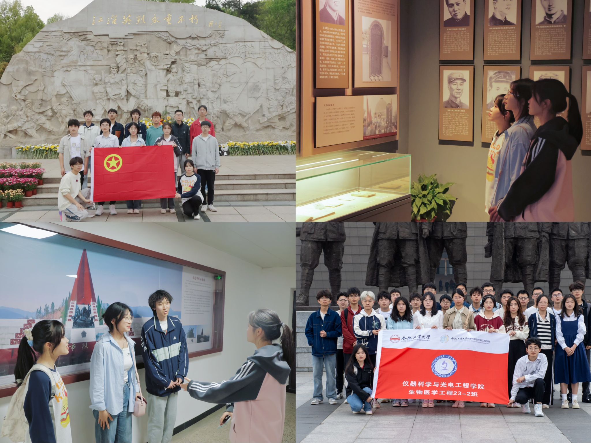贯彻德育为先,强化立德树人。4月4日、4月13日仪器类(智能感知)23-5班、生物医学工程专业23-2班团支部组织同学们前往合肥市蜀山烈士陵园、渡江战役纪念馆,开展重走红色足迹、追溯红色记忆、了解红色人物、挖掘红色故事、体悟红色文化等活动,通过查阅历史资料、实地参观的形式,追寻不同时期内英雄模范人物(集体)的红色故事,深刻感受革命先驱的英勇斗争精神,在缅怀革命先烈的同时,引导同学们弘扬伟大建党精神,让红色基因、革命薪火代代传承。