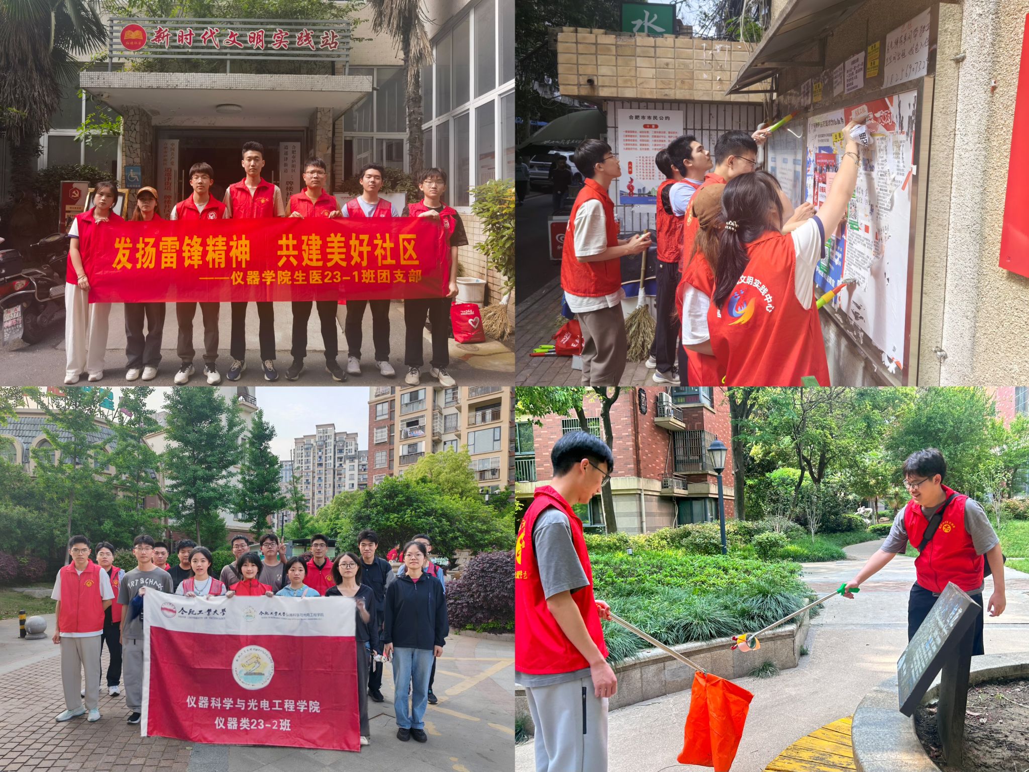 落实劳动教育,坚持寓教于劳。4月10日——4月28日生物医学工程23-1班、仪器类23-2班、仪器类23-4班团支部分别与合肥市庐阳区红旗社区、肥西县桃花社区、廿埠社区、肥东县先锋社区深入结对,组织同学们主动向社区和青年之家报到。在社区团组织的统筹下,开展“环保共赢,创造美好未来”“青年榜样,引领成长”“垃圾分类,绿色低碳”等劳动教育、志愿服务活动,通过多渠道引导同学们力所能及地参与基层治理日常工作,弘扬崇尚劳动、热爱劳动、辛勤劳动的劳动精神。