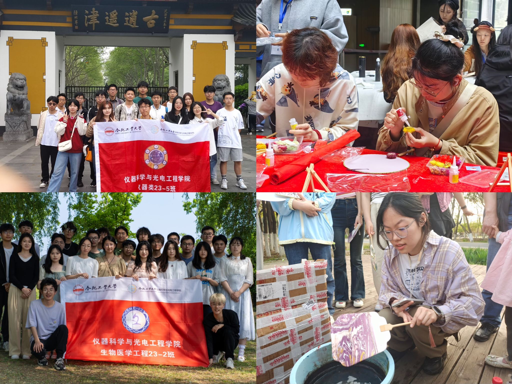 发展体育美育,促进人格完善。4月7日——4月27日仪器类(智能感知)23-1班、23-2班、23-5班、生物医学工程专业23-2班团支部分别组织同学们前往合肥市南艳湖公园、逍遥津公园、柏堰湖生态公园开展班级素质拓展活动及传统文化体验活动。同学们走出校园,走进自然,通过户外活动锻炼体魄,增强团队合作精神,培育健康心态。通过传统文化体验,同学们发现美、欣赏美、创造美。