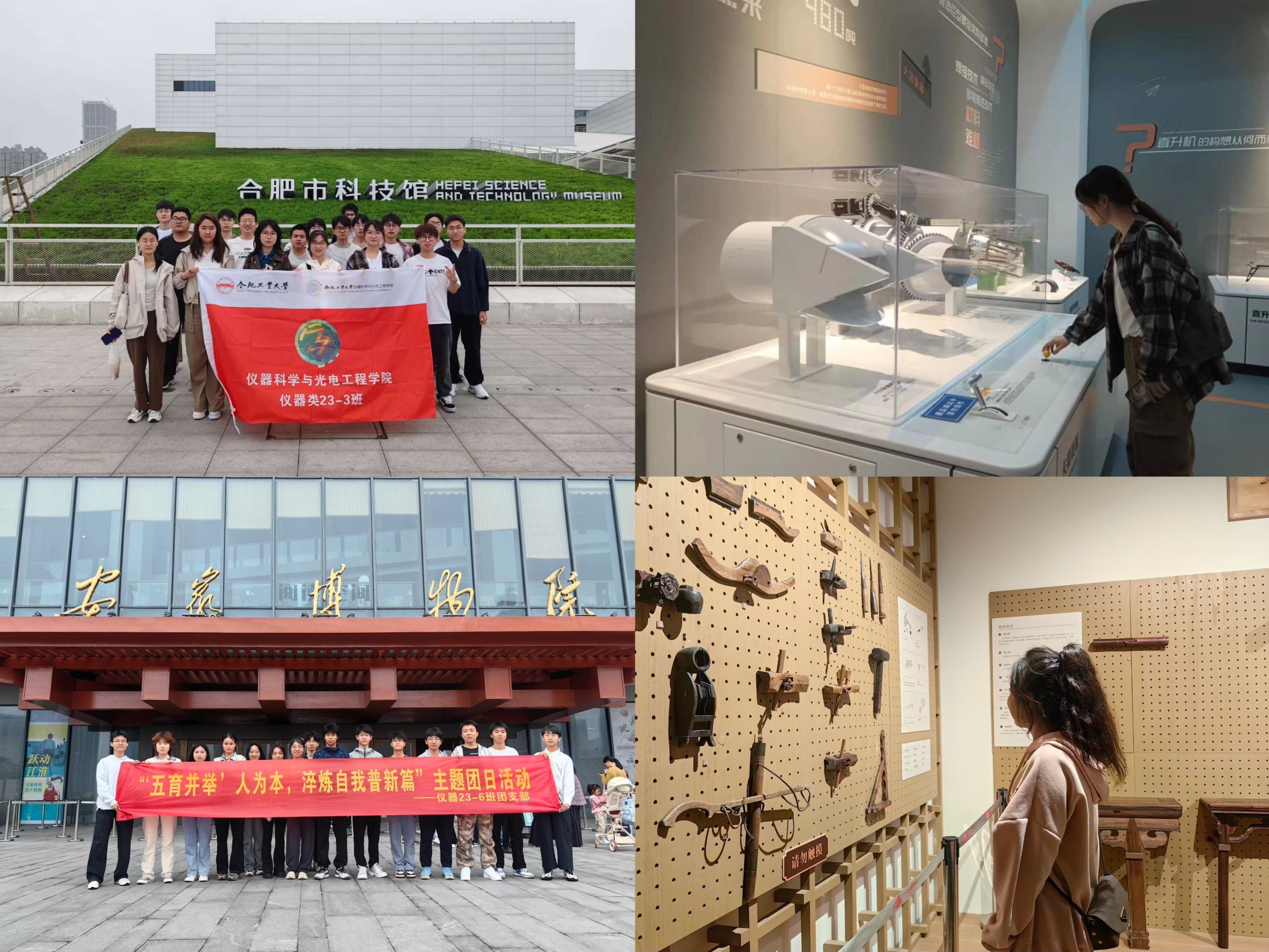 提升智育水平,聚焦提质增效。4月13日、4月14日仪器类(智能感知)23-3班、23-6班团支部组织同学们前往安徽省博物馆、安徽省地质博物馆、合肥市科技馆,着力培养大家的思维能力,激发创新意识。在参观过程中,从各个历史阶段社会发展代表性的文化遗存、珍贵文物、历史事件和历史人物中,同学们清晰地了解到安徽历史文明发展的脉络;从宇宙的起源到地球的形成再到生命的进化,同学们直观地感受到宇宙起源与地球演变的壮观历程;从“自然、人类、科技、文明”的展陈内容到视频演播、实物展示、动手操作等丰富的交互体验,同学们深刻地领悟到了科技的进步与发展为人类文明进程和人们日常生活带来的巨大变迁。