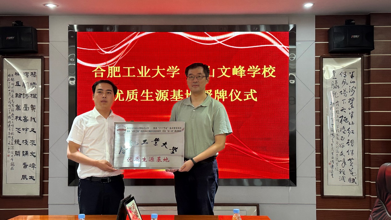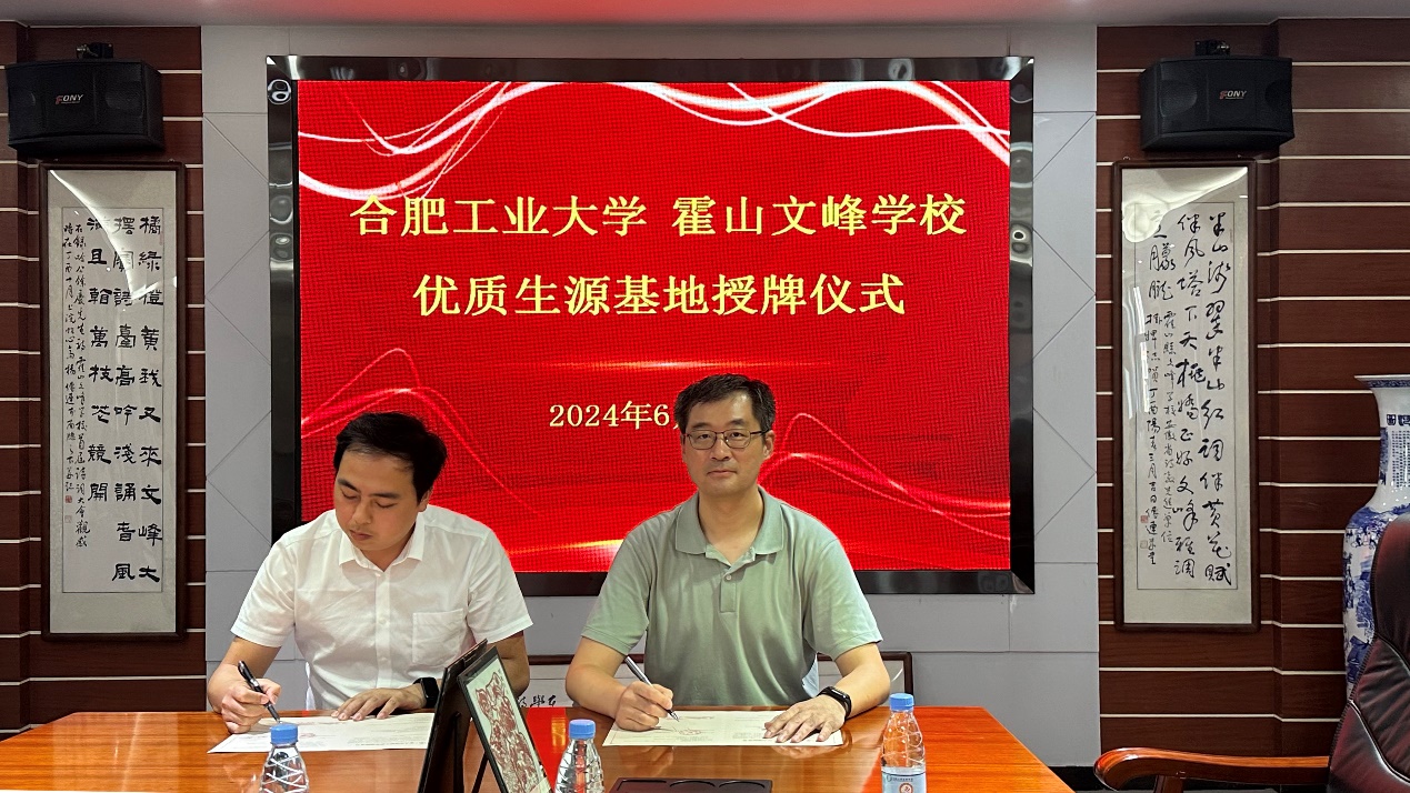 为不断扩大学校知名度,持续提升学校生源质量,6月12日,yL23411永利官网登录招生宣传组赴霍山开展yL23411永利官网登录与霍山文峰学校“优质生源基地”签约及揭牌仪式。yL23411永利官网登录副院长张进、光电系副主任徐梦洁,霍山文峰学校副校长汪仁林,高中部校长方舟、副校长叶远冬,以及部分班主任代表、家长代表、学生代表参加。
